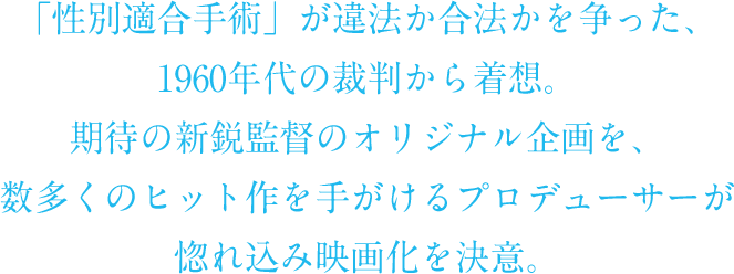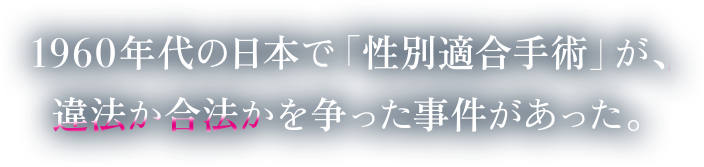 1965年、オリンピック景気に沸く東京で、街の浄化を目指す警察は、街に立つセックスワーカーたちを厳しく取り締まっていた。ただし、ブルーボーイと呼ばれる、性別適合手術[*当時の呼称は性転換手術]を受け、身体の特徴を女性的に変えた者たちの存在が警察の頭を悩ませていた。戸籍は男性のまま、女性として売春をする彼女たちは、現行の売春防止法では摘発対象にはならない。そこで彼らが目をつけたのが性別適合手術だった。警察は、生殖を不能にする手術は「優生保護法」[*現在は母体保護法に改正]に違反するとして、ブルーボーイたちに手術を行っていた医師の赤城(山中 崇)を逮捕し、裁判にかける。
